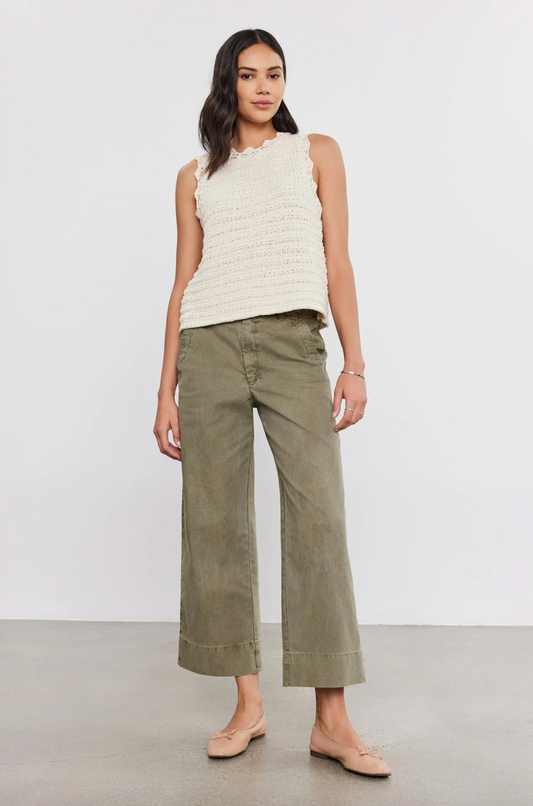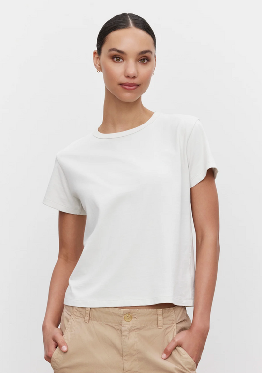 Cashmere Stripe Distressed Crew in Stone and Navy