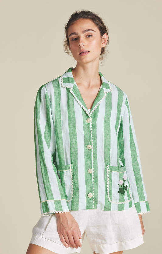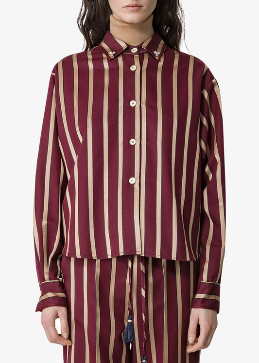 Wool and Satin Stripe Cropped Shirt with Crystals in Ruby