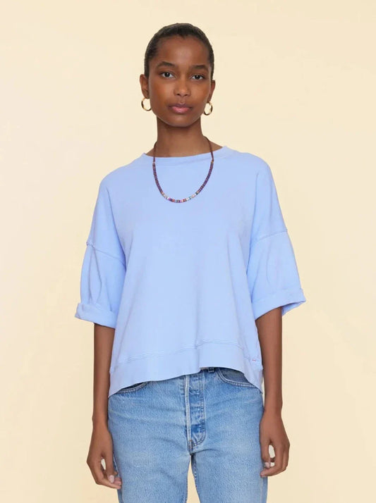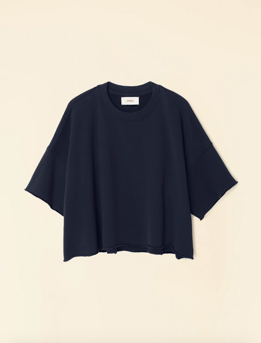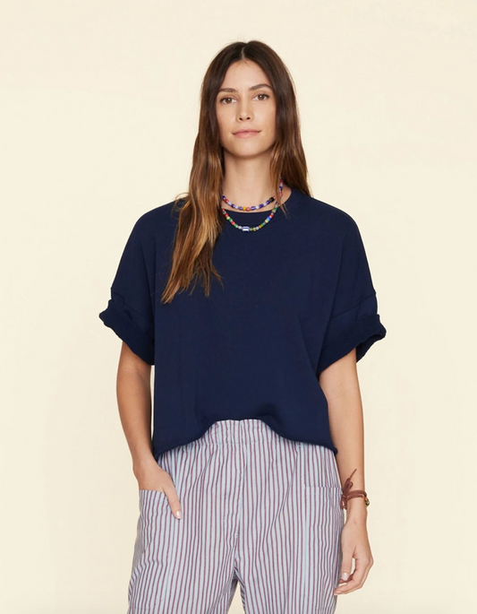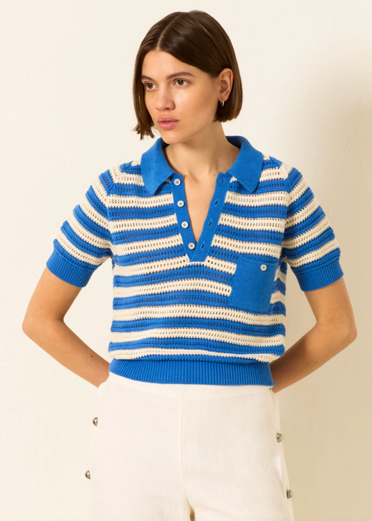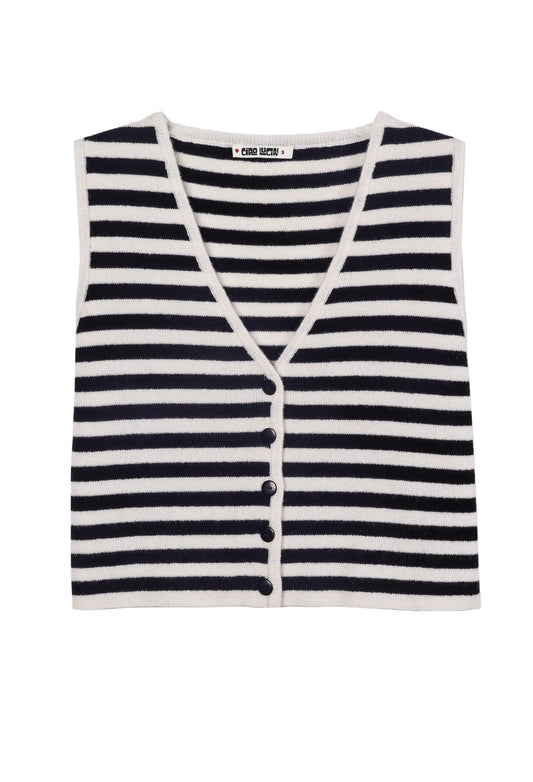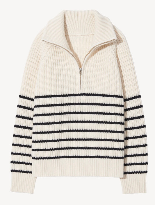 Cashmere Stripe Distressed Crew in Stone and Navy