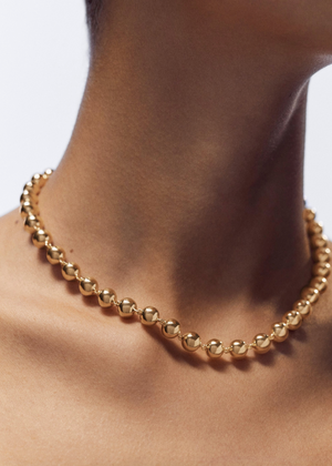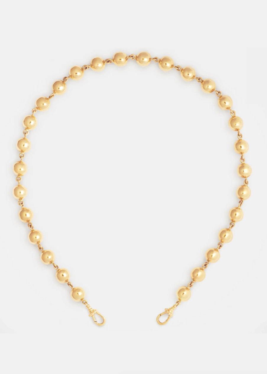 Yellow gold ball chain, designed with handcuff clasps at each end.