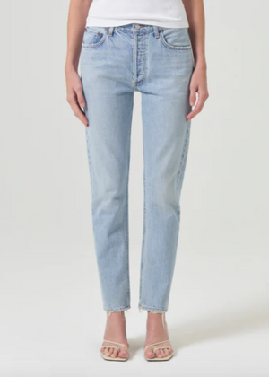 The Austin Jean features a flattering mid-rise waist with a slim tapered leg hitting right at the ankle.