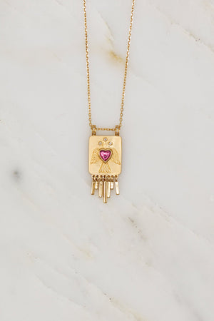 Céline Daoust is known for her ability to blend fine craftsmanship with spiritual and emotional significance in her designs. The Angel Plate necklace beautifully merges elegance with meaning. At its center, a bright pink tourmaline heart is delicately set within the engraving of an angel, symbolizing protection and love. Complementing the pendant are diamond accents and dangling details, enhancing the necklace’s soft, feminine silhouette.