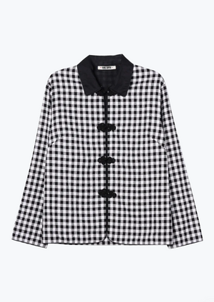 Meet the Anja Jacket: a crisp take on vintage tailoring, crafted in lightweight silk with a soft black-and-ivory gingham pattern. Designed with a slim silhouette, traditional notch lapel, and single-button closure, it layers beautifully over everything from a simple tee to a silk dress.