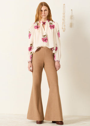 Inspired by a '70s silhouette, the Annabel has puff shoulders and a feminine ruffled collar. The cotton voile shirt is hand-block-printed with a detailed poppy motif.