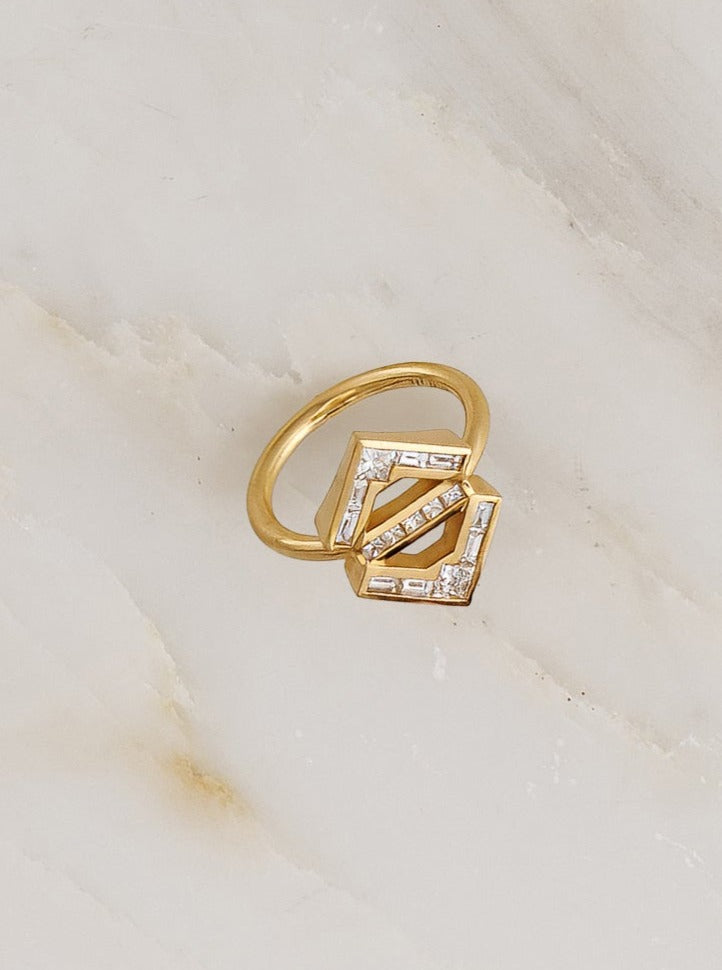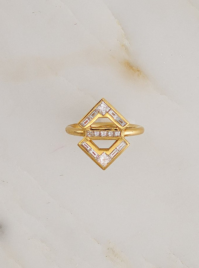 Made and hand-finished in LA, 18k yellow gold ring featuring white baguette and princess cut diamonds.