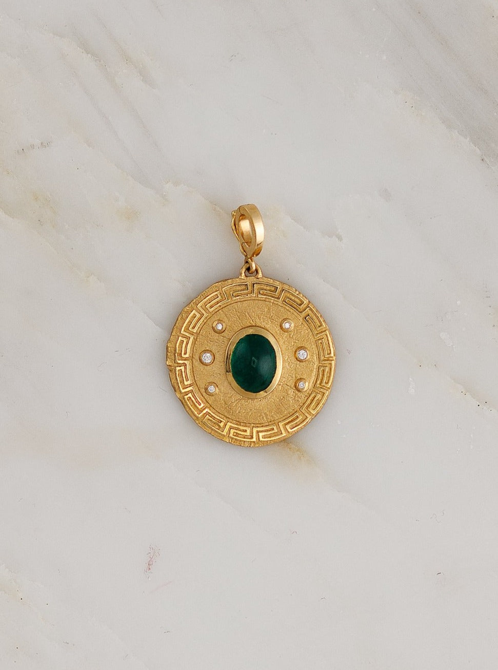 Made and hand-finished in LA, featuring a stunning emerald surrounded by diamond accents. This pendant comes on a charm clasp that opens and closes to be worn on any suitable chain.