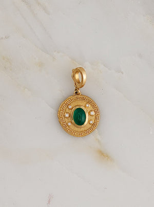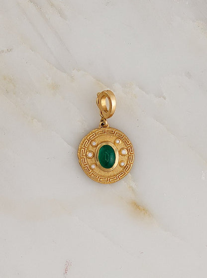 Made and hand-finished in LA, featuring a stunning emerald surrounded by diamond accents. This pendant comes on a charm clasp that opens and closes to be worn on any suitable chain.