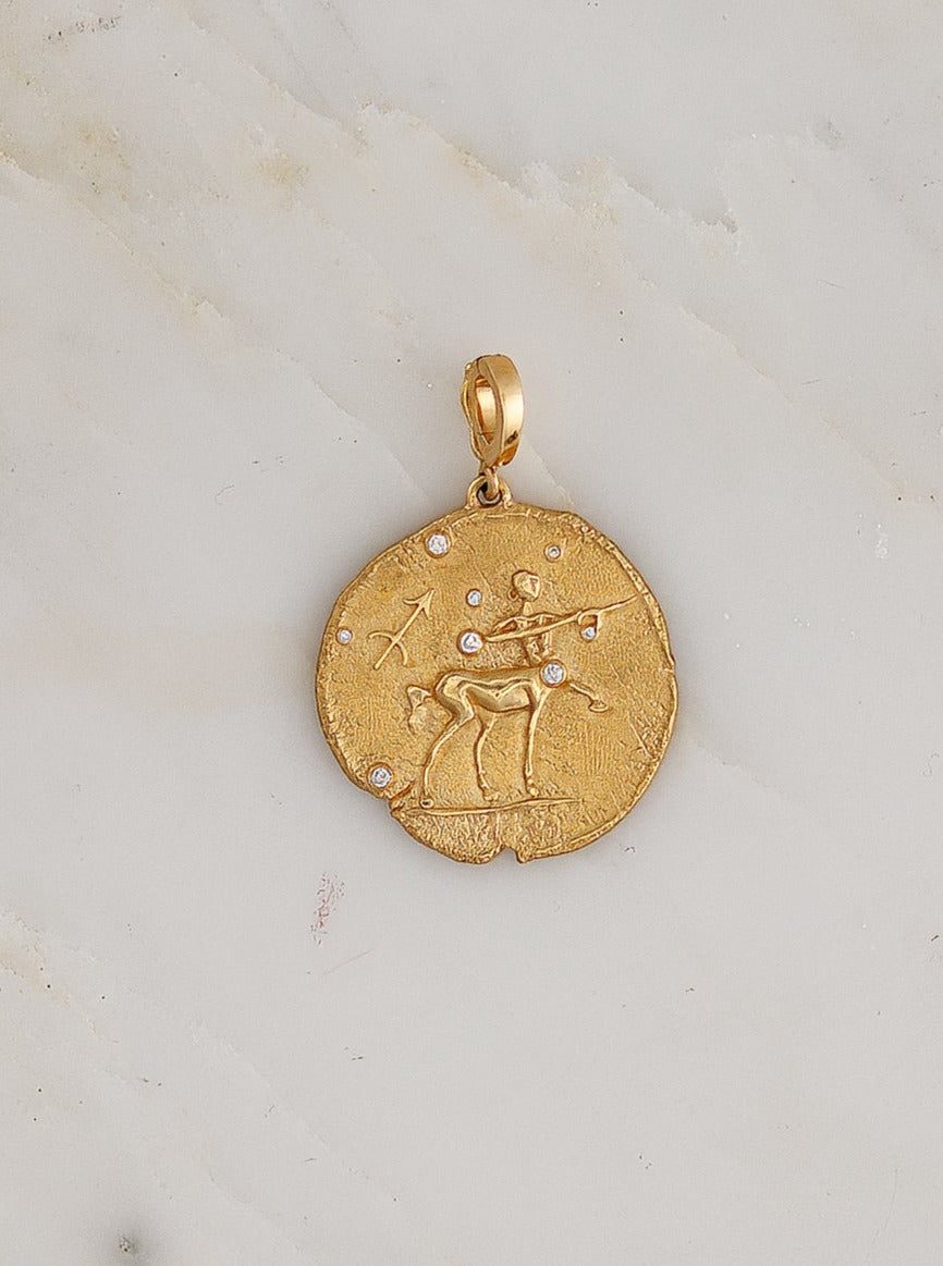 Featuring Ancient Greek Zodiac symbols with their constellations overlayed in diamonds. Each is engraved on its back with its Zodiac sign. This pendant comes on a charm clasp that opens and closes to be worn on any suitable chain.