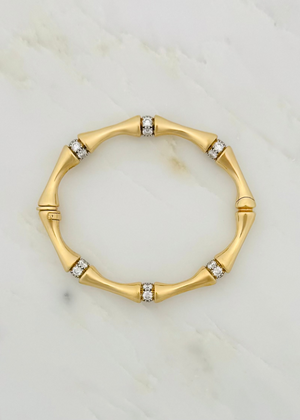 Crafted in 18k yellow gold, the Gold Bamboo Bracelet by Grace Winfrey features a classic bamboo cane design, detailed with round brilliant diamonds for a subtle shimmer. The refined, hinged silhouette is as elegant as it is wearable—ideal for daily stacking, or wearing as a solo statement.