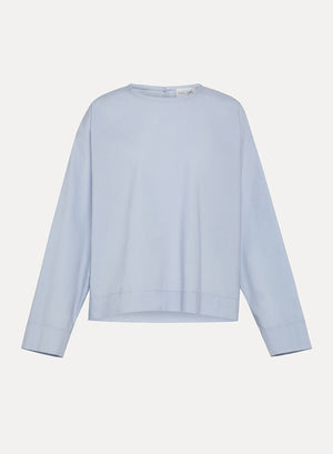 Long sleeve blouse made in BCI cotton poplin, designed with pleat details, straight hem, and a round neck with keyhole detail at the back.