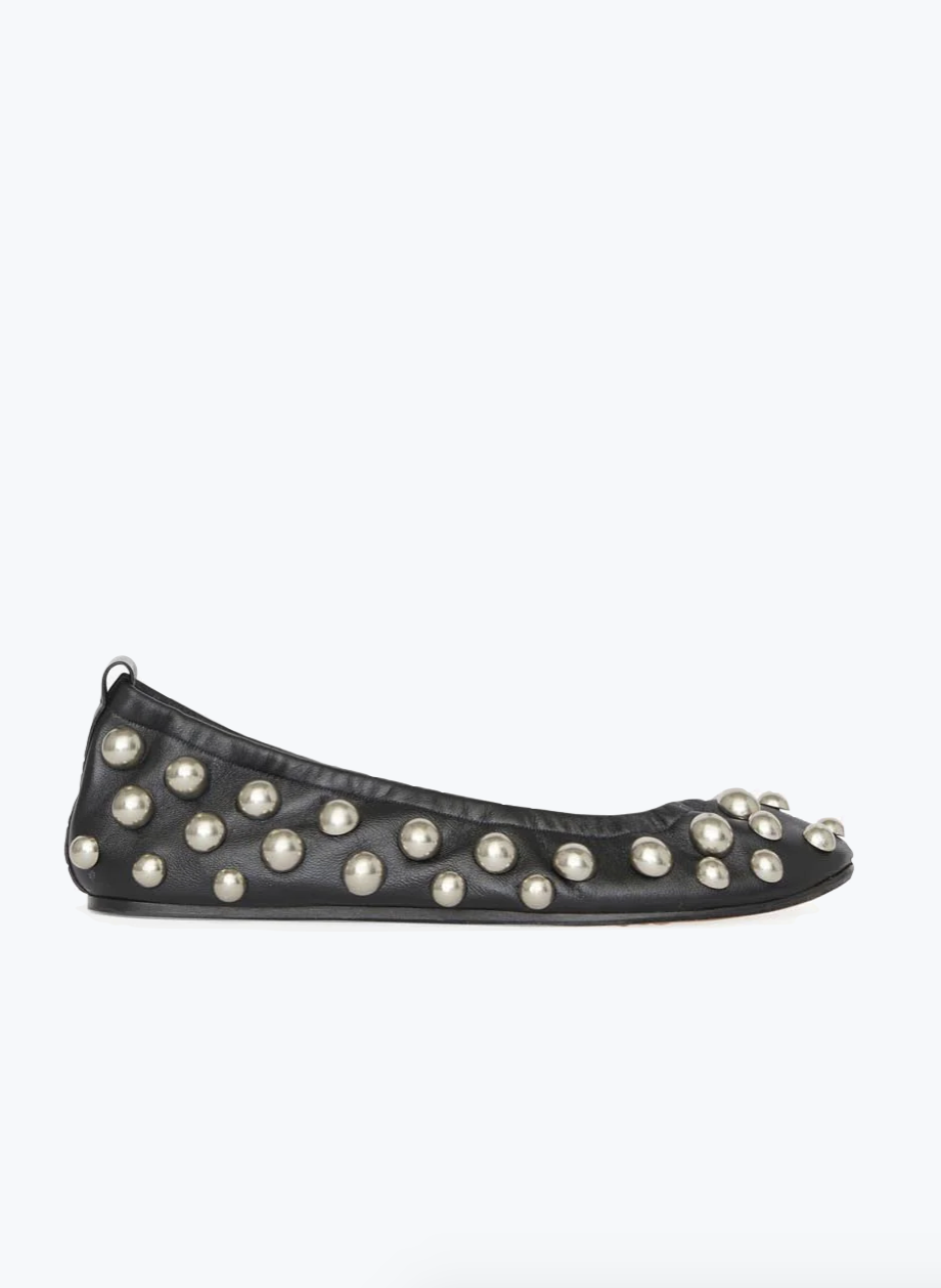 An edgy update to the classic ballet flat in black leather with silver stud embellishments.