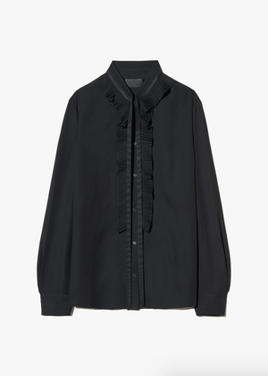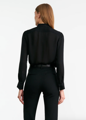 Straight slim fit blouse. Pleat and tie neck details. Center front button closure. Buttons at cuffs.