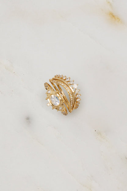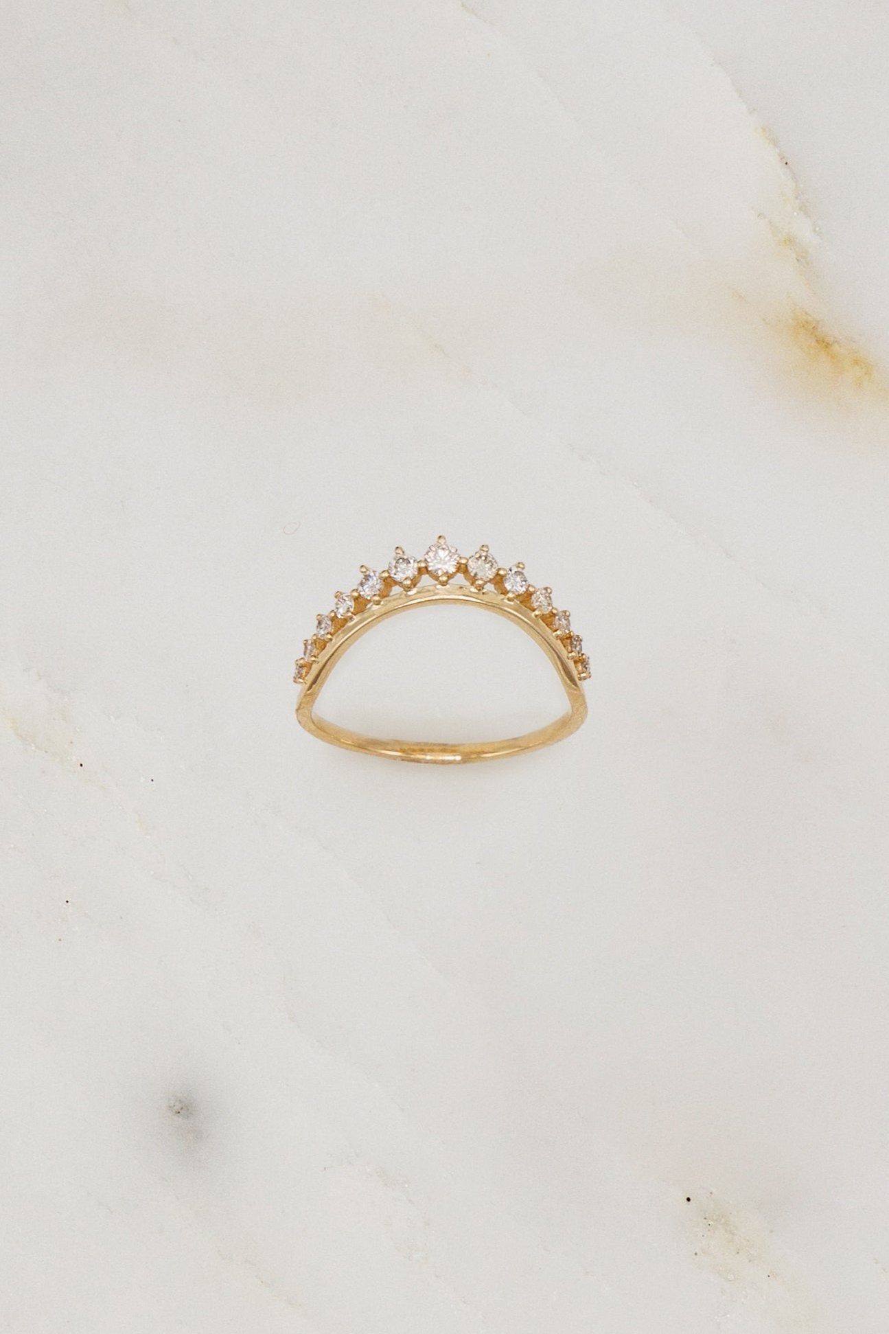 Crafted from 14k yellow gold, this ring features a distinctive crown silhouette which gives it a regal and elegant presence on the finger. The crown shape is enhanced by a series of white diamonds, artfully set to create a stunning halo effect. Stack it with some of your favorite rings for an extra dose of cool - pictured here with the Moonstone and Diamonds Eye Ring.