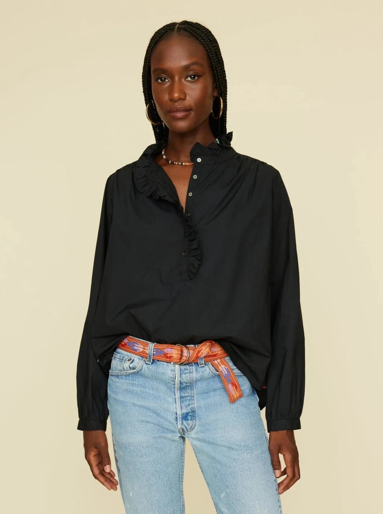 The Caspian top is a ruffle henley made from a mid-weight crisp cotton poplin, featuring ruffle details all throughout the neck and front placket. This elevated henley also has shirring at the sleeves, front, and back and a high low hem.