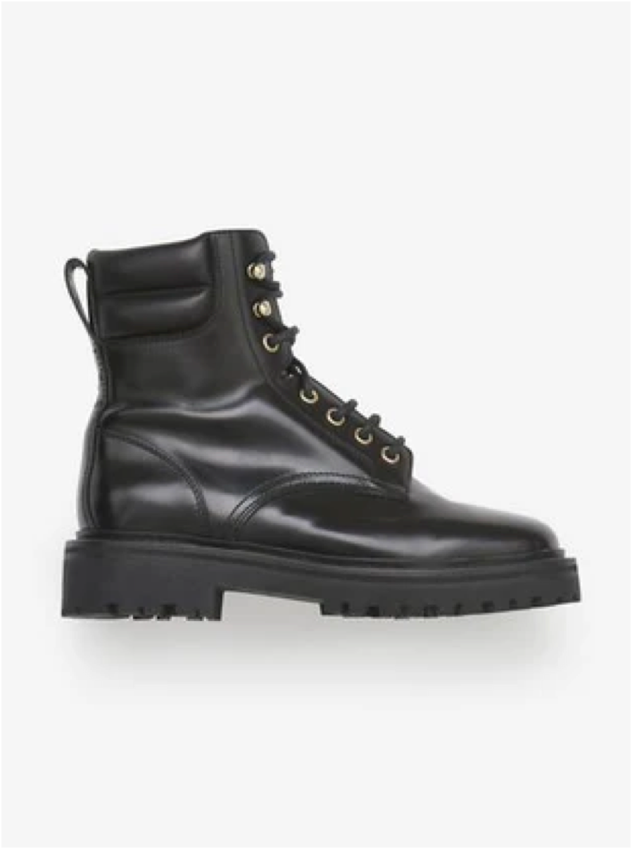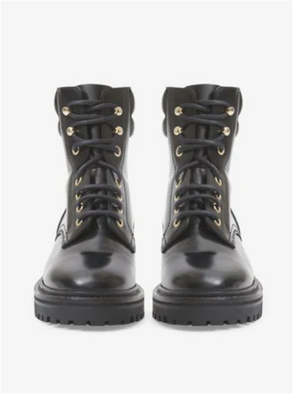 Calfskin ankle boots, shiny finish, lace-up front closure, round toe, ankle height.