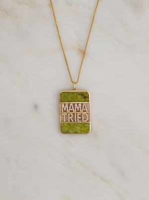 Solid 14k yellow gold "MAMA TRIED" pave diamond pendant necklace with Brazilian opal inlay on 16" chain.