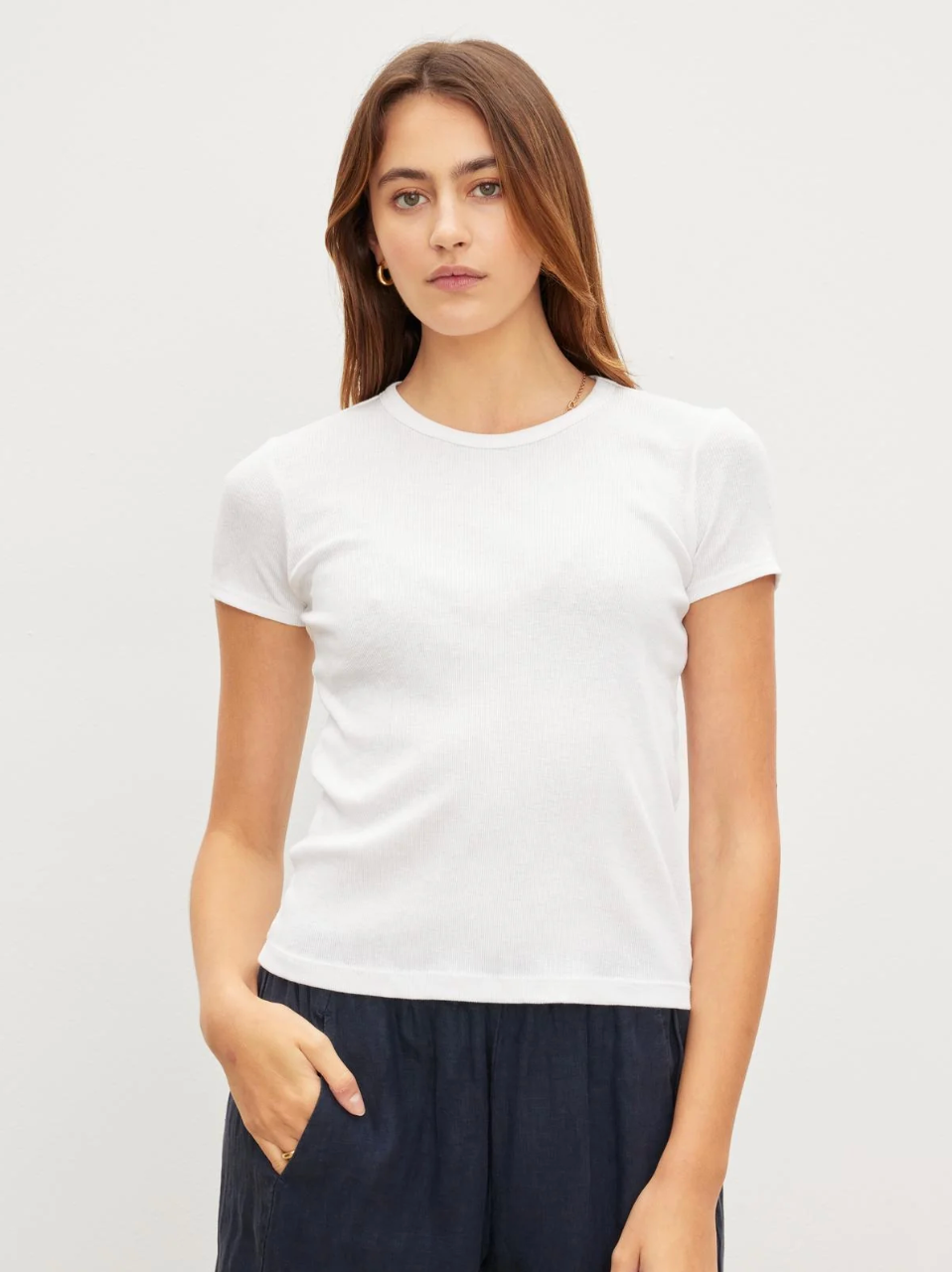 Made from a soft ribbed cotton knit for a cozy feel, designed with a crew neckline and fitted, slightly cropped silhouette.