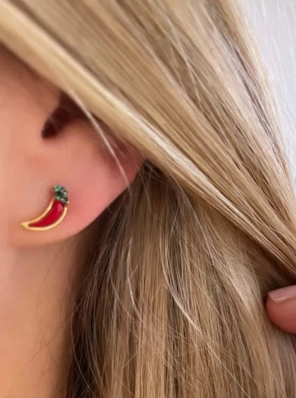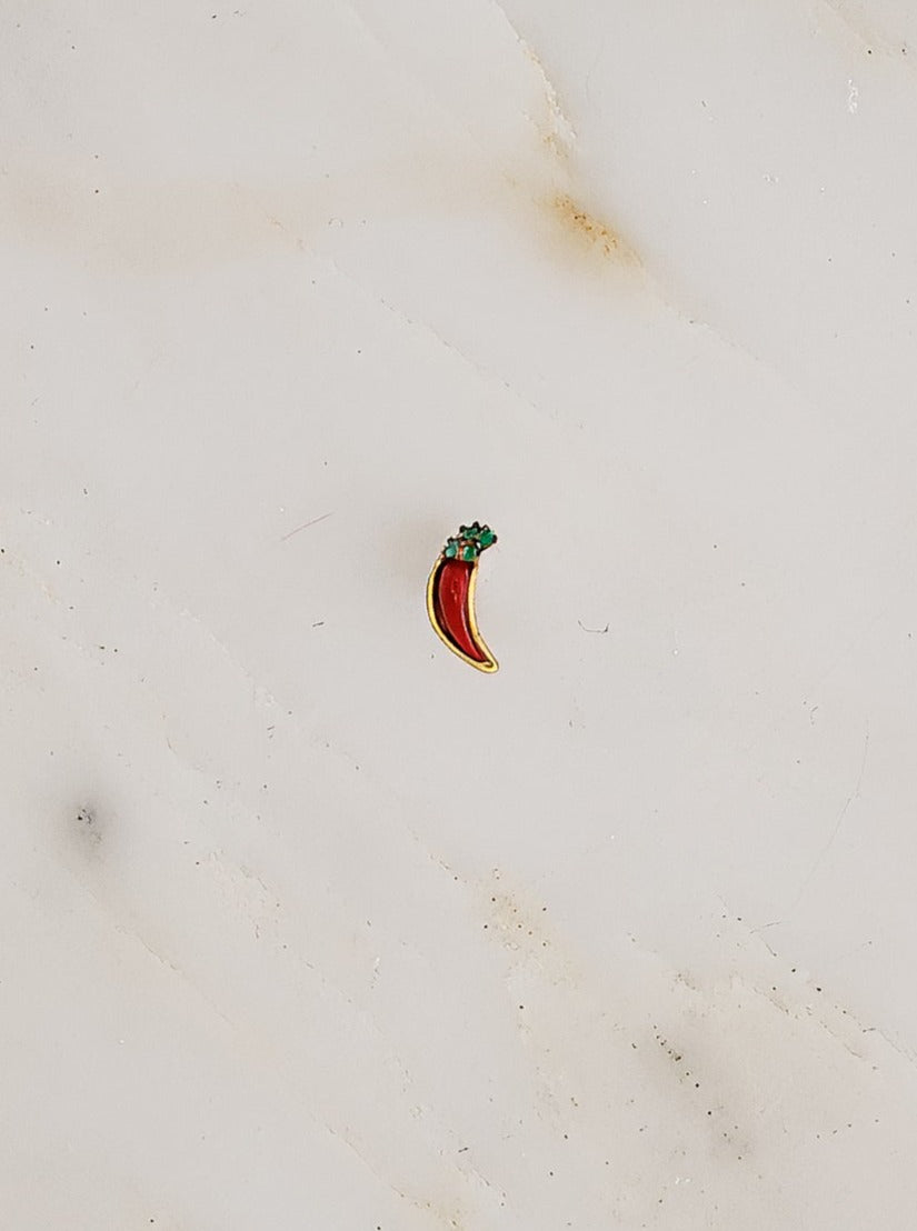 18k yellow gold chili pepper stud with rhodium, carved reconstituted coral, and emeralds.