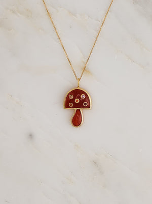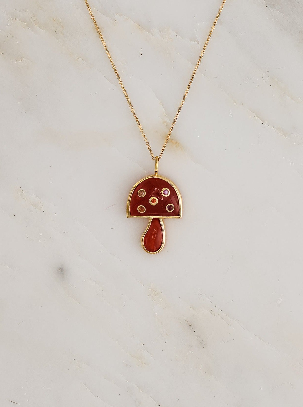 Mushroom pendant necklace made from 18k yellow gold, carved carnelian, and sapphire cabochon insets on 16" cable chain.