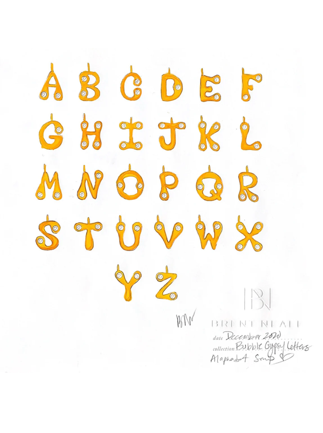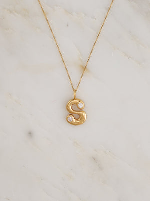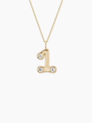 Bubble letter pendant necklace made from 18k yellow gold and diamond insets on 18" cable chain.