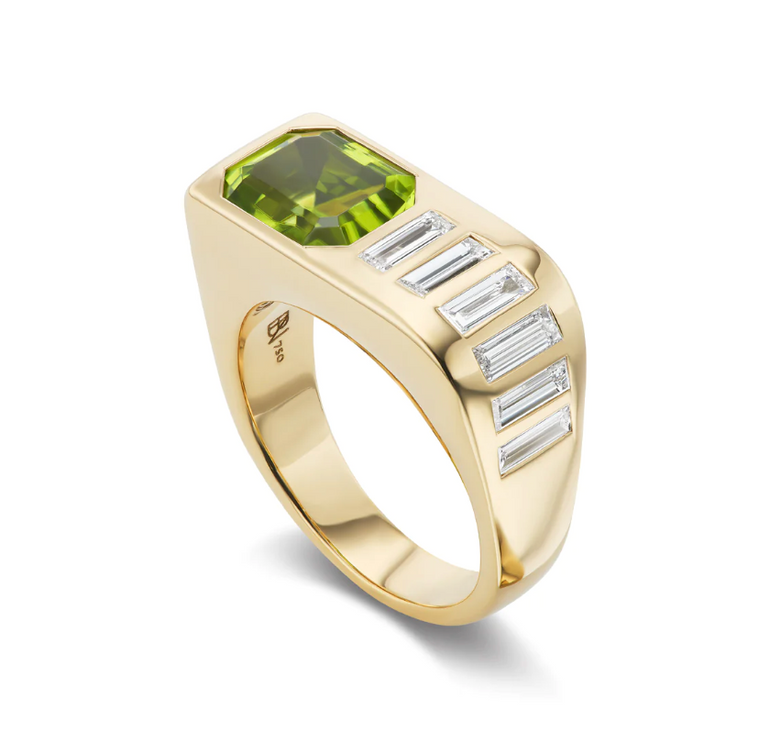 This one-of-a-kind ring is crafted from 18k yellow gold, featuring an emerald cut peridot and a waterfall of diamond baguettes along the top and running down the side of the shank.