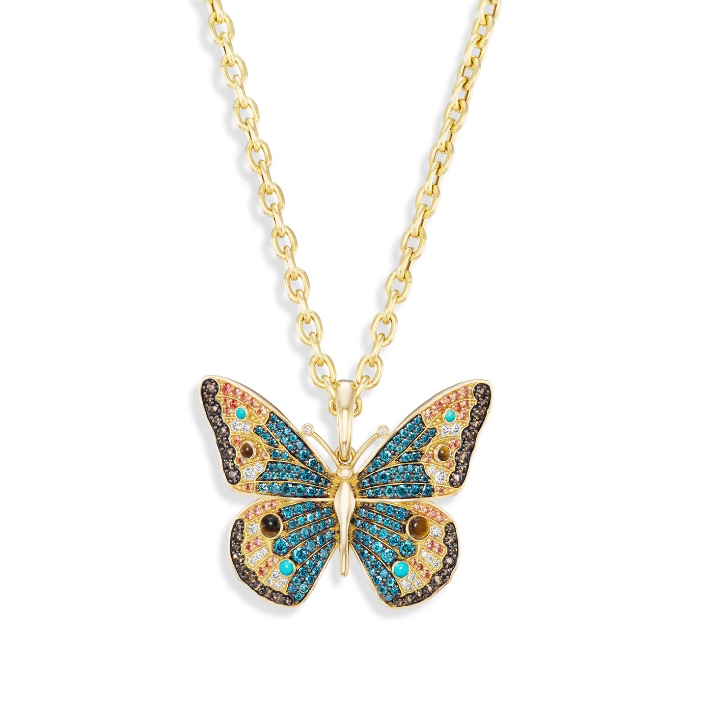 18k Yellow Gold, Blue Diamonds (1.08cttw), White Diamonds (.35cttw), Orange Sapphires (.38cttw), Smokey Quartz (.51cttw), Carved Turquoise and Tigers Eye