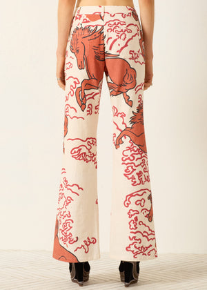 Cut from hand-loomed Khadi cotton, this jean-cut pant is slim through the thighs with a flared leg. It features a large-scale mythical horse motif and a handmade button by ceramist Daphné Verley. Pair it with the matching Afternoon Rouge Pegasus Blazer.