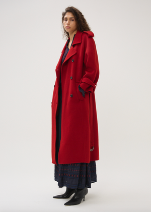 Equal parts classic and statement-making, the Byrne Cicero coat by Maria Cher delivers instant edge with zero effort. Cut from a crimson wool blend, it features an easy, slightly oversized fit with dropped shoulders, wide lapels, and deep front pockets for when you need to stash your phone (or warm your hands). A tonal belt adds shape without trying too hard. Throw it on and go—this is the kind of coat that does the work for you.