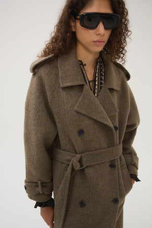 Equal parts classic and statement-making, the Byrne Cicero coat by Maria Cher delivers instant edge with zero effort. Cut from a crimson wool blend, it features an easy, slightly oversized fit with dropped shoulders, wide lapels, and deep front pockets for when you need to stash your phone (or warm your hands). A tonal belt adds shape without trying too hard. Throw it on and go—this is the kind of coat that does the work for you.