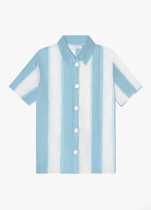 This bold intarsia stripe shirt, featuring delicate pointelle detailing, gives a fresh twist on a classic Calle Del Mar silhouette. The playful, multi-colored stripes create an elongating, figure-flattering illusion. Intended for a menswear-inspired fit and complete with a pointed collar, center front placket, and our signature iridescent shell buttons, this shirt embodies what it feels like to be a Calle Del Mar girl: adventurous and always ready for the next getaway. Wherever you are, the Cabana Stripe Short Sleeve Shirt will make you feel like you're on vacation.