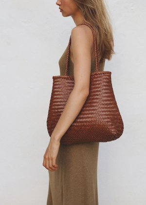 Handwoven from natural leather, the Cala Tote strikes a balance between relaxed texture and clean structure. Lightweight yet sturdy, it’s roomy enough for daily essentials -laptop, market finds, and the everyday odds and ends.