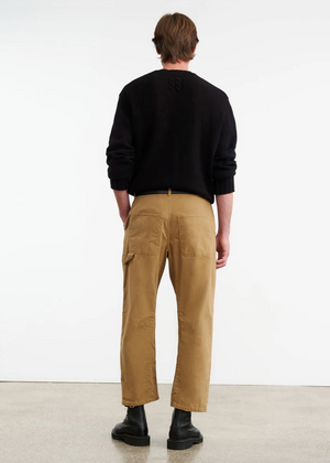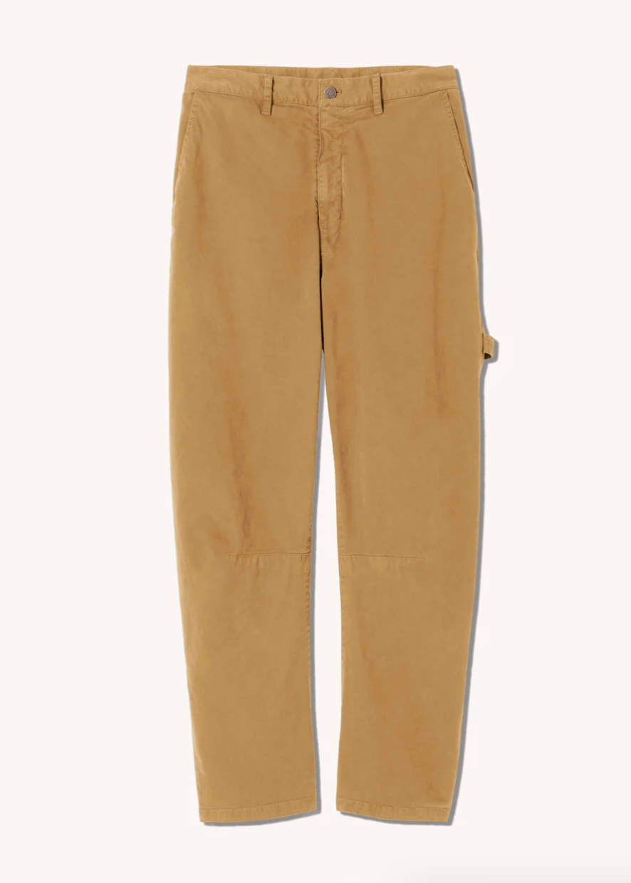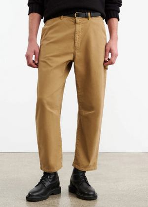 Flat front, boxy bowed leg pant emphasized by darts. Left utility strap. Front slash pockets. Back patch pockets. Fully constructed front zip. Horn button closure. Belt loops. Designed for a 26.5" inseam.