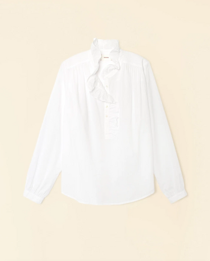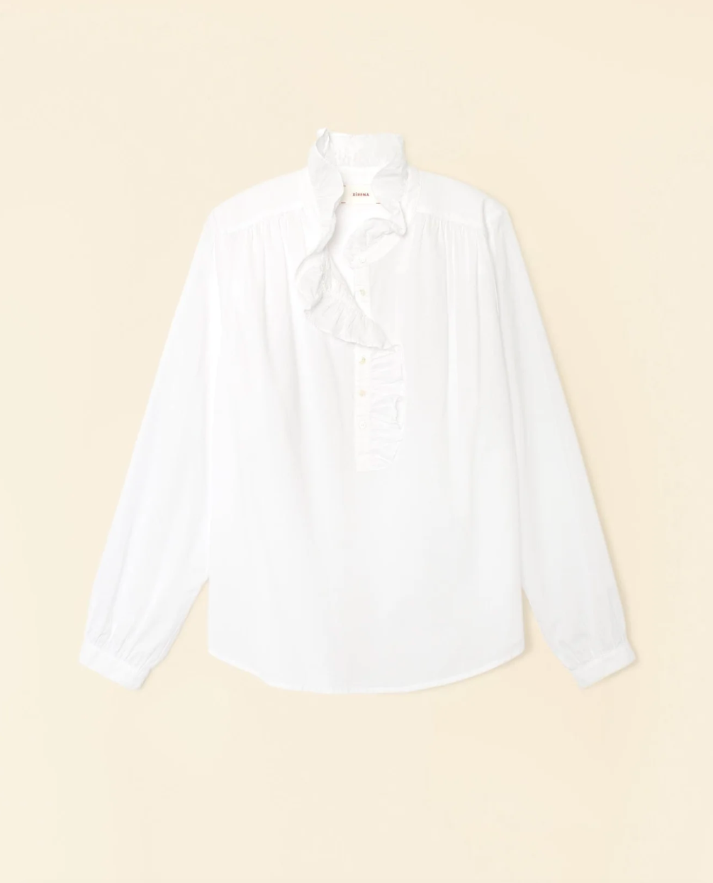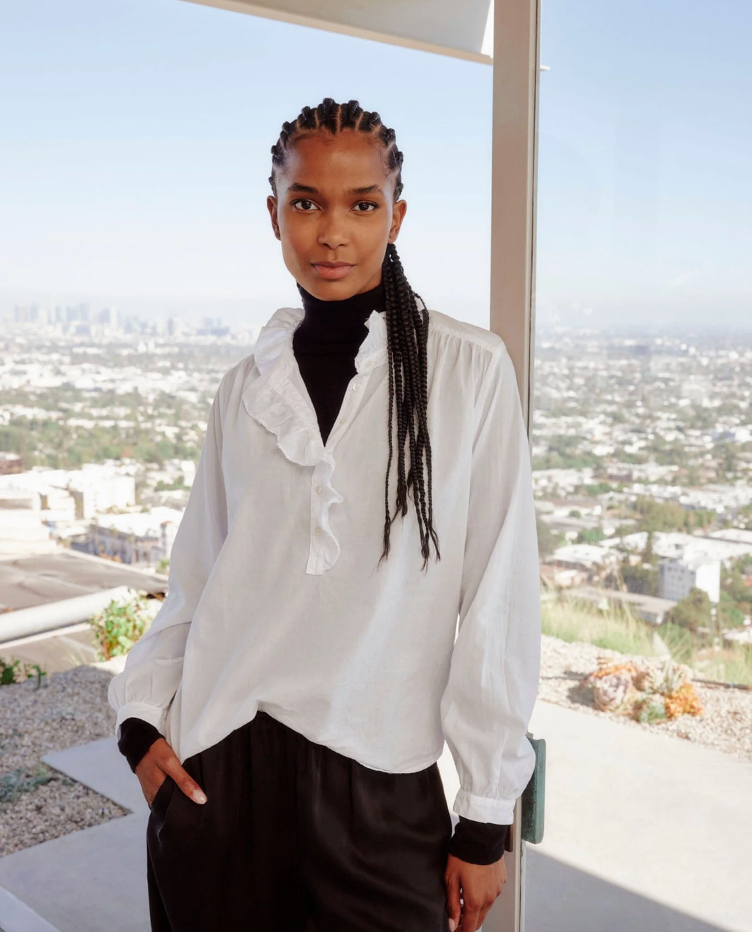 The Caspian top is a ruffle henley made from a mid-weight crisp cotton poplin, featuring ruffle details all throughout the neck and front placket. This elevated henley also has shirring at the sleeves, front, and back and a high low hem.