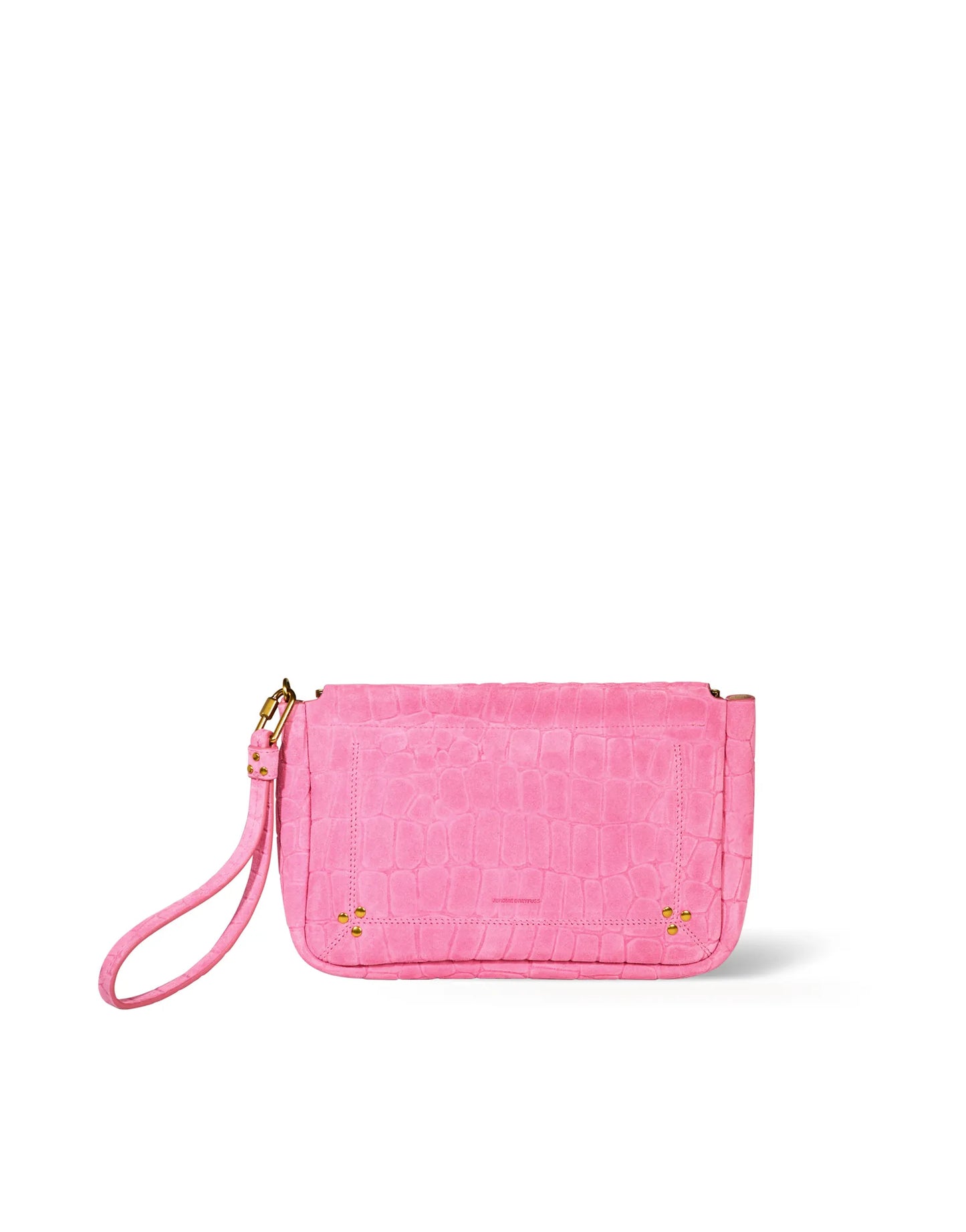 Designed with a structured frame and snap closure, this Jerome Dreyfuss Clap Clutch is crafted in croc embossed suede and finished with signature brass hardware. Wear it handheld or tuck it under your arm. This minimalist essential adds polish to your look, day or night!