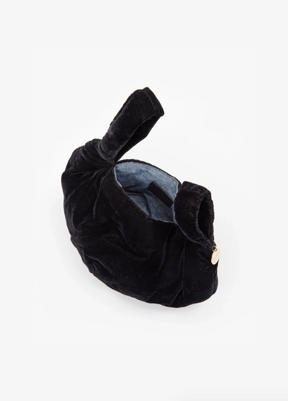Made from chic black velvet, this round pouch is designed with an open top and double strap crossover closure. Carry it by looping the longer handle through the smaller one.
