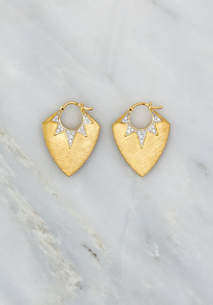 Inspired by the iconic shape of a guitar pick, these earrings offer a modern twist on a classic motif, making them a standout accessory for music lovers and fashion enthusiasts alike. Crafted from 18k yellow gold with white rhodium and diamond accents, the unique shape creates an eye-catching silhouette, while the lightweight design ensures comfort for all-day wear.