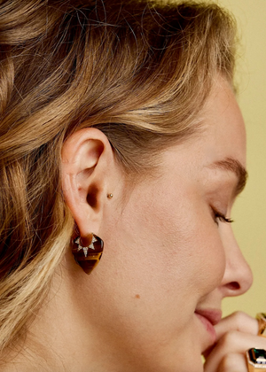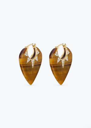Awaken your inner rockstar with these handcrafted 18k yellow gold earring in a guitar pick shape with carved Tiger's Eye and diamonds.