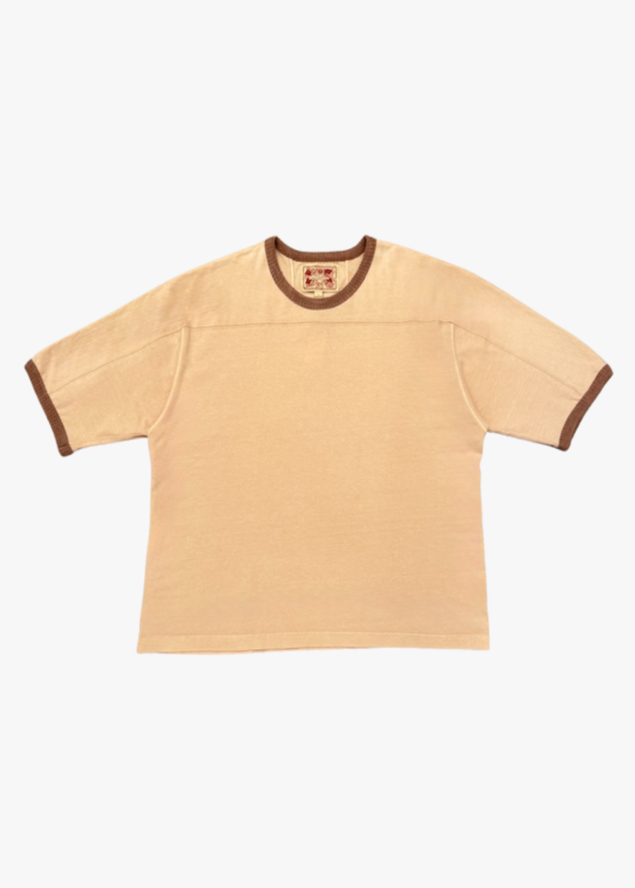 Boxy fit tee with wide body and slightly cropped length with contrast rib detail at neckline and sleeve opening. The sleeve length extends just below the elbow. Chest seam runs across the chest and down the sleeve to mirror your favorite vintage 70's football shirt.