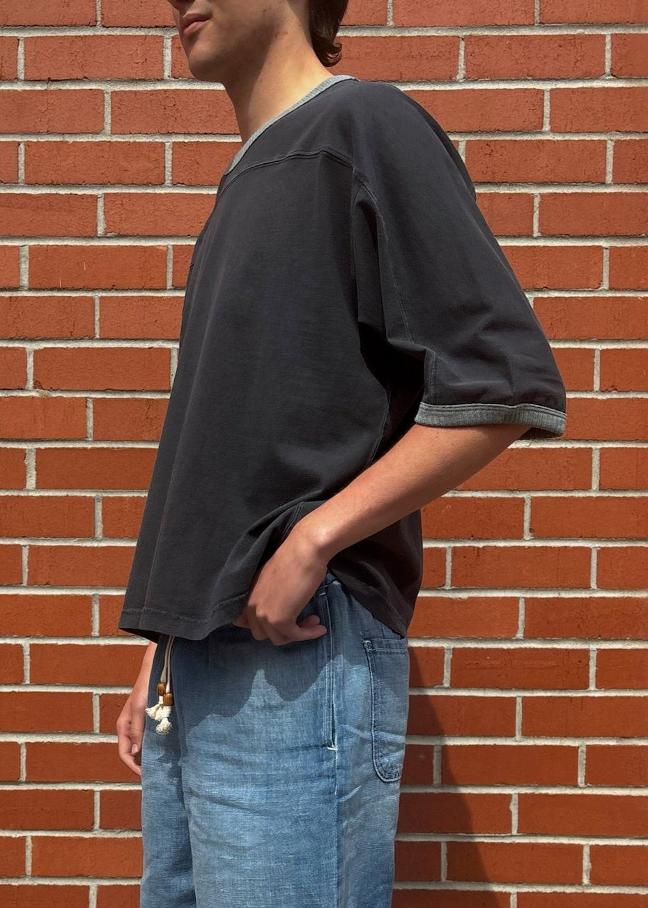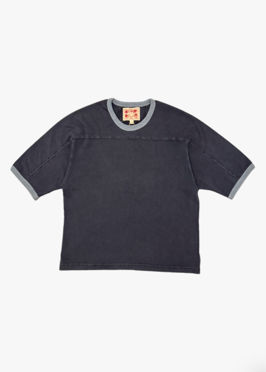 Boxy fit tee with wide body and slightly cropped length with contrast rib detail at neckline and sleeve opening. The sleeve length extends just below the elbow. Chest seam runs across the chest and down the sleeve to mirror your favorite vintage 70's football shirt.