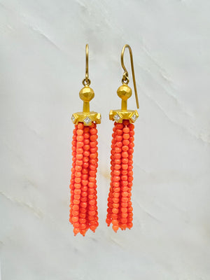 Coral tassel earrings. Handmadeby Cathy Waterman in Santa Monica, California.
