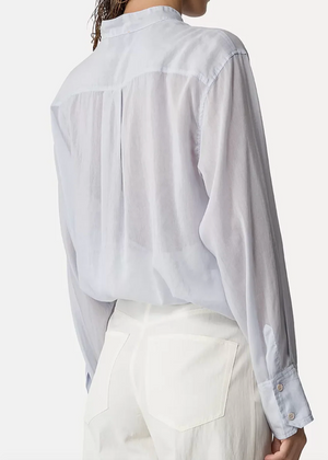 Long sleeve cotton and silk voile ruffle collar shirt.