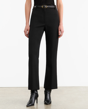 Flat front, high-rise straight leg cropped trouser in Italian non-stretch wool. Fitted through hips. Zip fly. Hidden hook-and-bar closure. Hidden stay button closure. Belt loops. Back welt pockets.