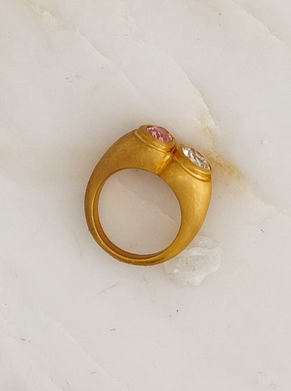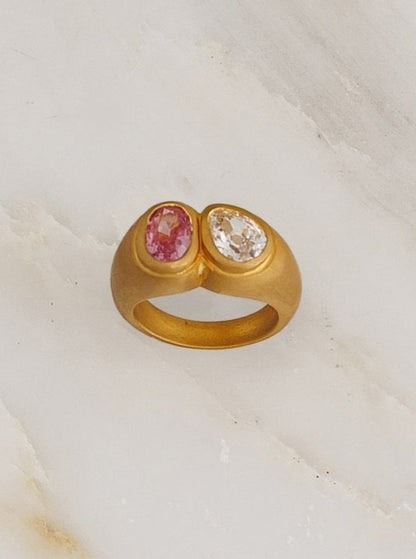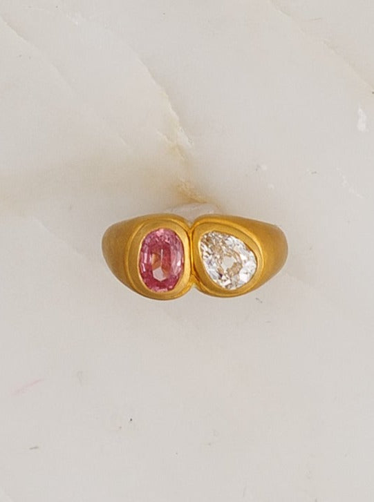 Made by hand, featuring a 1.31 ct Padparadscha sapphire and 0.96 ct antique pear diamond, set side by side in the iconic Darius double stone setting. Crafted from solid 18k Fairmined yellow gold band and brushed for a satin finish.