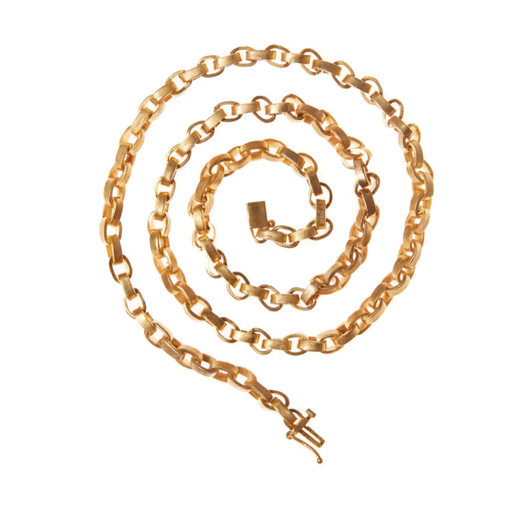 This handmade Darius signature chain necklace is crafted from a combination of 24k and 18k yellow gold. Each 18k yellow gold link is plated with matte 24k yellow gold to give the piece a warm tone. Finished with an 18k yellow gold safety clasp. Available in two lengths: 17" or 24".