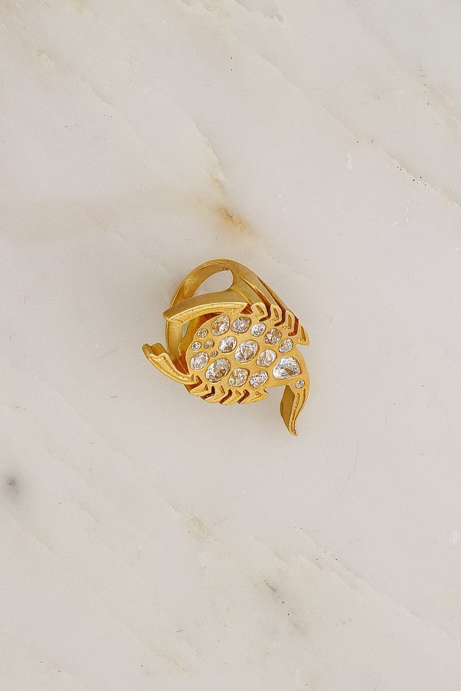 Darius Hand carved Dendera Diamond Scorpion Ring featuring2.82 cts Antique Old Mine Cut Diamonds and a 0.43 cts Antique Pear Cut Diamondset in 18K Fairmined yellow gold and dusted with 24k Fairmined yellow gold.