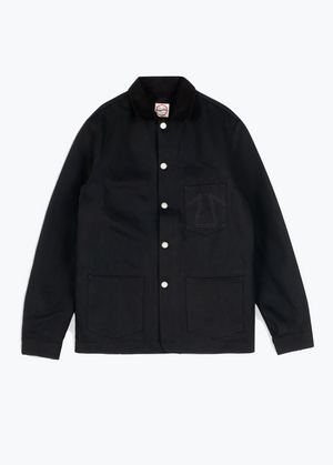 This heavy duty worker jacket was made from 14 Oz Japanese Black / Black Red selvedge denim. Features a corduroy collar, two reinforced hip pockets with signature Eat Dust Z-bar tonal stitching and a chest pocket with contrasting Z-bar stitching. Finished with faded copper buttons. Body lining in black cotton, sleeve lining in red nylon.