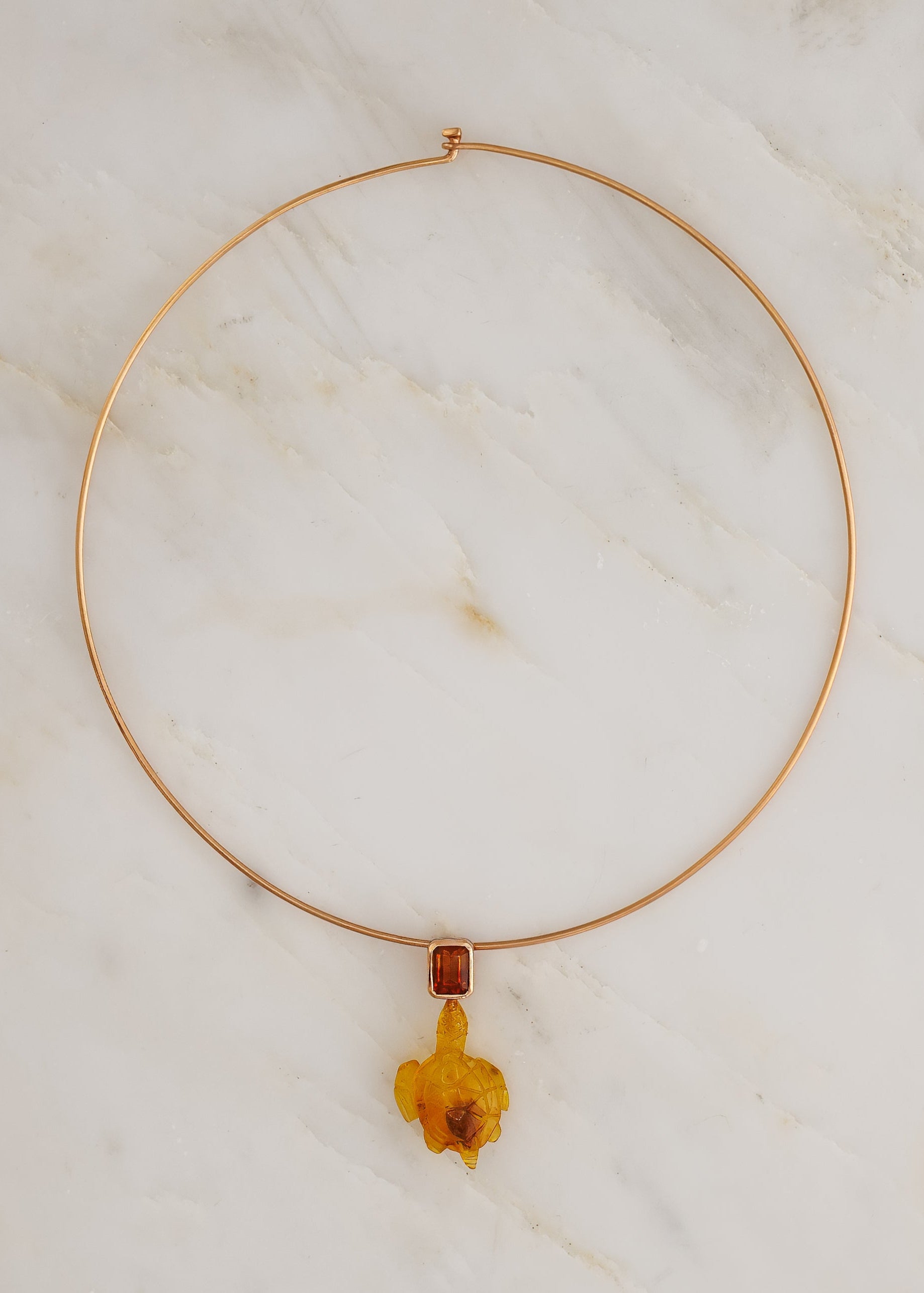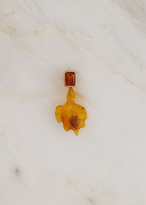 Hand carved amber turtle charm with emerald cut citrine set in 18k rose gold.