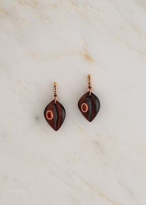A pair of 18k rose gold and shark fin enamel huggies featuring hand carved red Tiger Eye cowry shell drops set with orange sapphires.