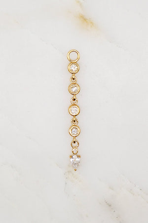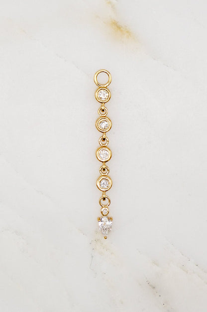 14k yellow gold charm adorned with bezel set round diamonds and one prong set pear diamond.
