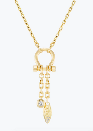 Handmade in New York City, each Carriage Drop pendant features a single brilliant round diamond set within a solid 18k yellow gold bezel, hanging from a 3-link swivel chain. Designed to style seamlessly with the Uniform ObjectSystem Necklace.